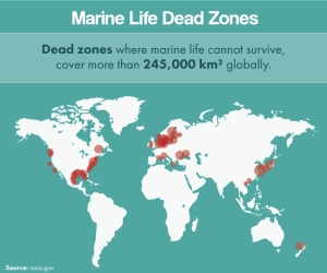 • The 17 billion pounds of fertilizer used to grow feed for cows flows into rivers and oceans, creating huge algae blooms or dead zones where nothing can survive. In the U.S. we find them in the Gulf of Mexico, off the coast of Oregon, and the Chesapeake Bay.